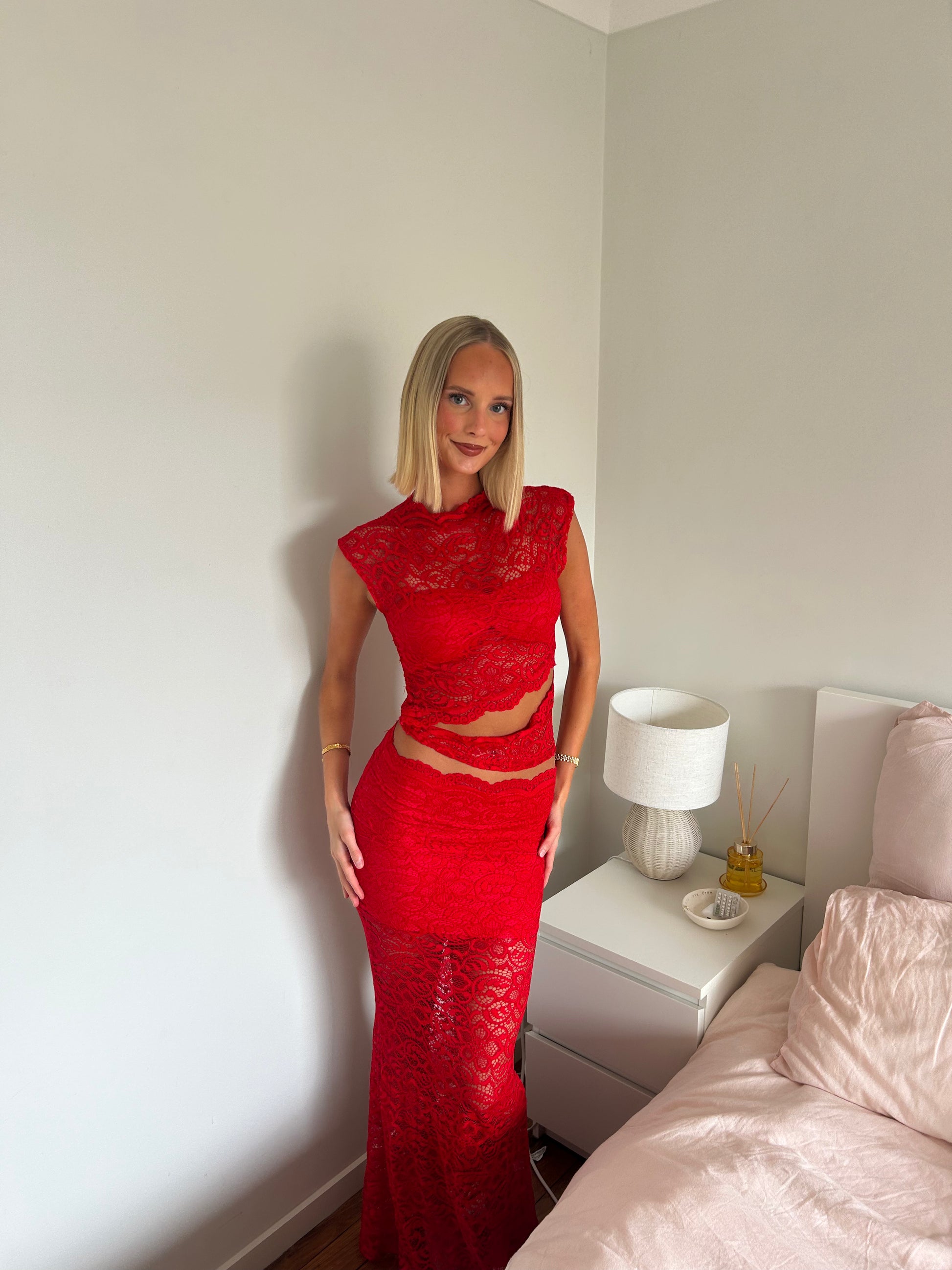 This beautiful set in intense red is crafted from an exclusive lace featuring detailed, floral-inspired patterns. The blouse and skirt has a form-fitting silhouette with gentle stretch and delicate edges, adding a feminine and sophisticated touch. The high lace neckline and scalloped hemline complete the design with a romantic flair.